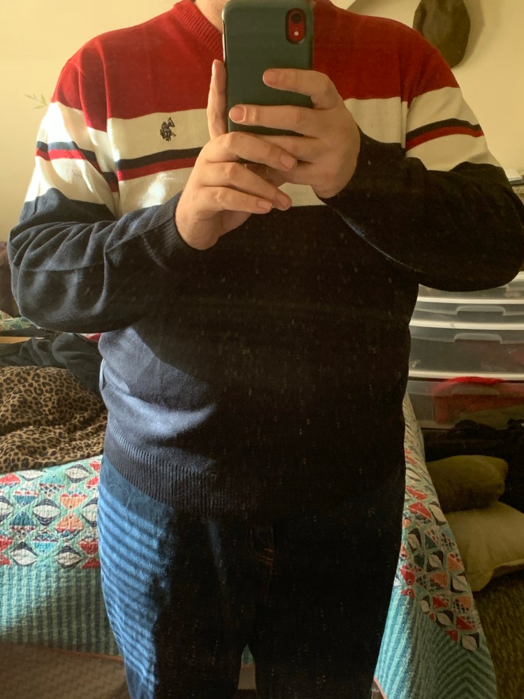 I wore the sweater on top to church yesterday morning. I bought it at JCPenney. I paired the sweater with my cognac leather jacket.