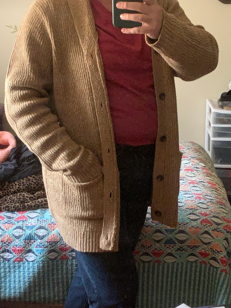 I wore the bottom one that afternoon with the teal V-neck. I bought it on oldnavy.com. The Old Navy cardigans are nice to wear around the house or for going out.