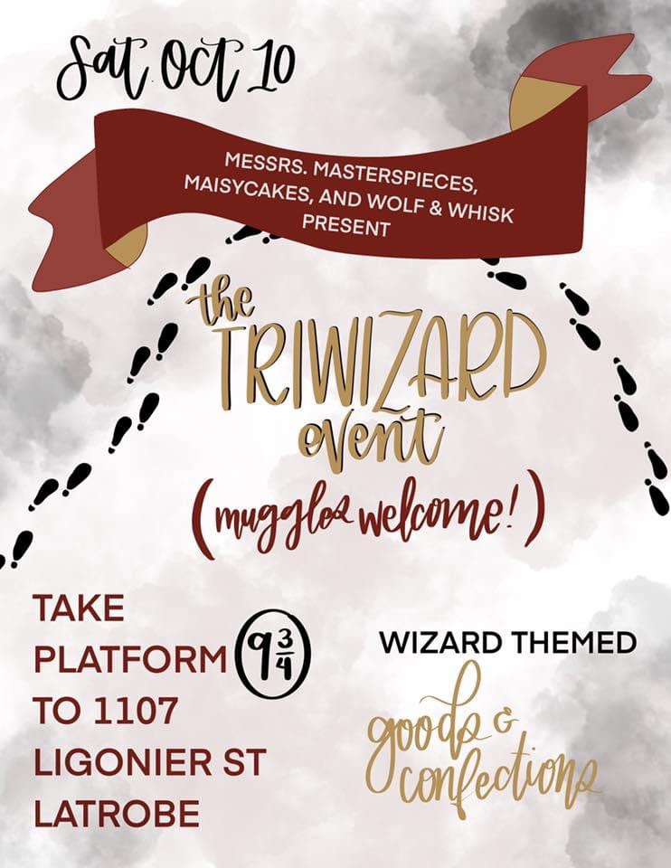 I will be making my small business rounds this weekend prior to the big event on Saturday night at Masterspieces. I plan to make my first stop at the Trendy Bunny Studio and visit with Team Trendy before heading off to Ligonier. I’ll probably throw in Majesty and RSVP as well. Ligonier needs the foot traffic with Fort Ligonier days cancelled this year. Finally I’ll make my way to Masterspieces for the big TriWizard Fest. Courtney will be collaborating with Kelsey of Wolf and Whisk and Cheri of Maisy Cakes. Lots of Harry Potter themed goodies. I’ll be rocking some Halloween swag.