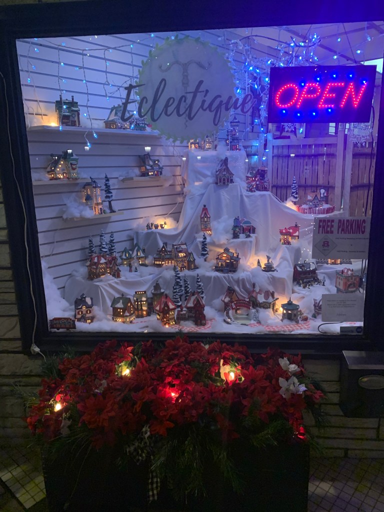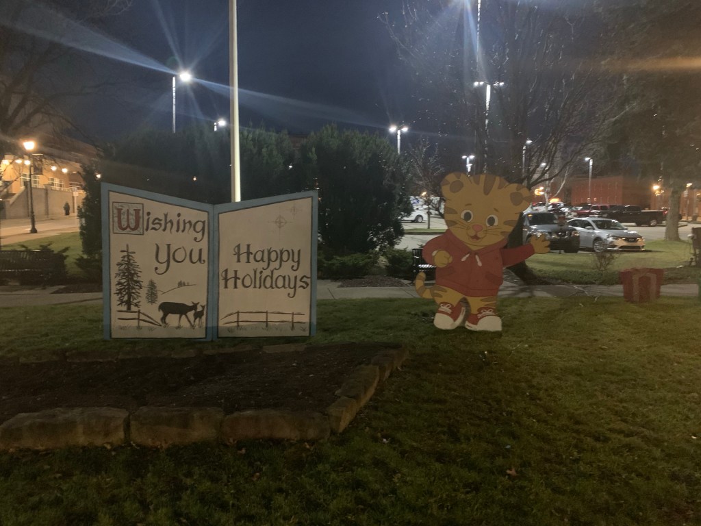 The tree was all lit up in Mister Rogers Neighborhood. Of course I snapped my picture of him on the bench. Daniel Tiger greets you as you come into town. I got him and all his friends. The storefronts looked so beautiful and lit up.