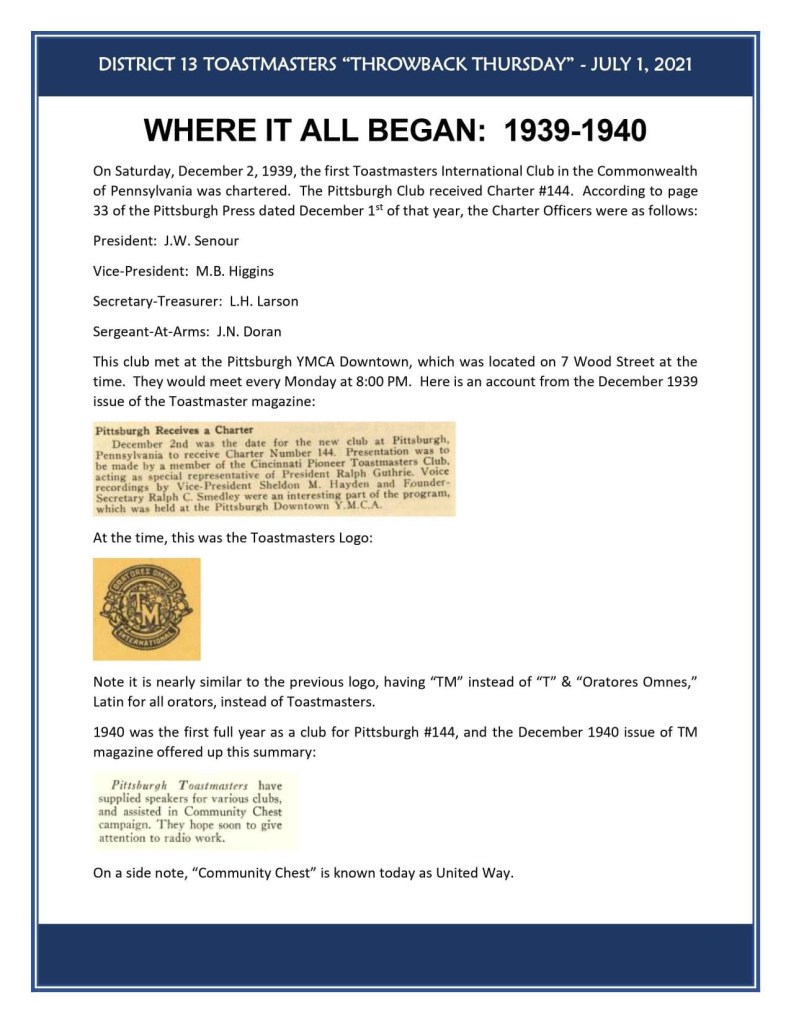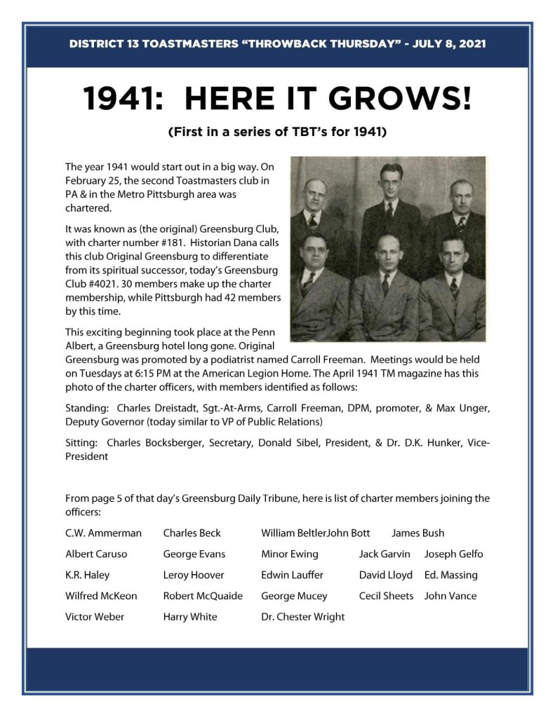 Recently, our friend and Distinguished Toastmaster Dana Mitnik became the District Historian and heβs come up with some amazing factoids about District 13 that he has been sharing on the D13 Facebook page. Here is his latest and it tells us that there was another Greensburg club in the early days of Toastmasters.