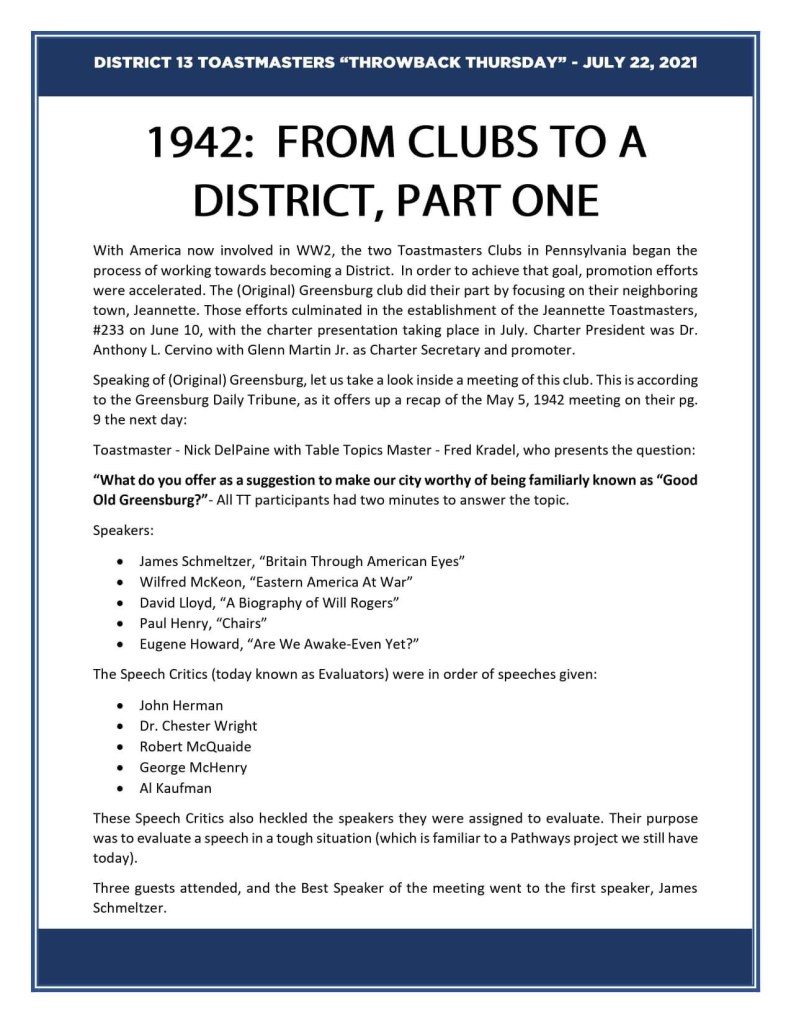 How about this Table Topics question? Whomever does it at our next meeting or a future meeting should look to this question as inspo. Calling evaluators Speech Critics? Interesting. I remember when we changed the titles of our executive leaders from Governors to Directors in the mid 2010βs. Times certainly have changed since 1942.