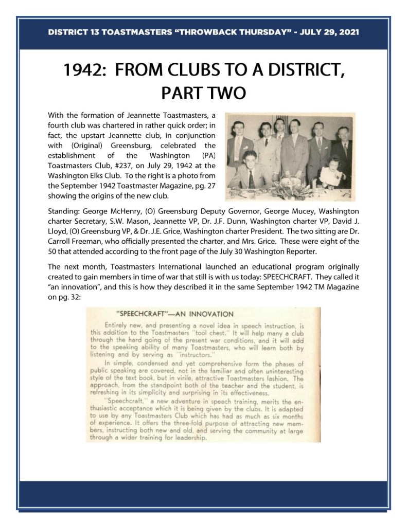 The establishment of the Washington PA Toastmasters in 1942 led to the establishment of District 13. We celebrated the Districtβs 75th anniversary at the final Fall Conference in October of 2017 at the Hilton Doubletree Hotel.