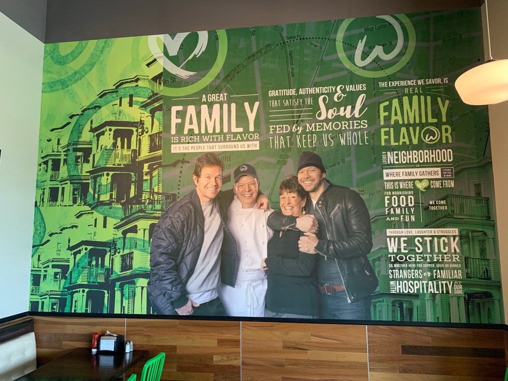 I fell in love with the decor. Above where I was seated, it shows every movie and act Donnie and Mark were a part of. For my New Kids on the Block fans, there is mention of the band. I noticed a lot of Steelers memorabilia as well. Here’s a nice picture of the Wahlberg family. I didn’t know the brothers came from a big family either. The things that you learn. I give decor a 9/10.