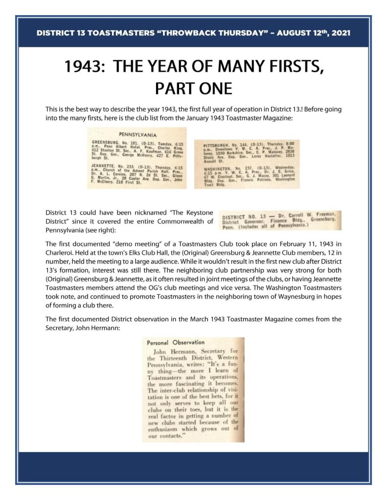 In 1943, the District was beginning to take shape. A demo meeting was held in Charleroi to a large audience and it formulated interest in new clubs in the foreseeable future. Jeannette and (original) Greensburg were able to have meetings together and there was interest in forming a club in Waynesburg. Greene County Toastmasters anyone? They could meet at Waynesburg University or possibly in Carmichaels.