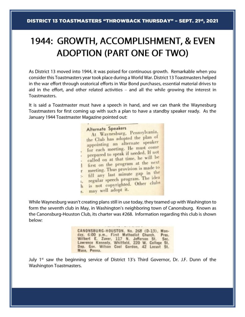 Just like during the COVID-19 pandemic 😷, District 13 Toastmasters was innovative. During World War II, they did their part to aid in the war efforts, all this while growing the interest in Toastmasters. Despite the world going through a trying time, the District was poised for growth. The Waynesburg chapter came up with the idea of having an alternate speaker on standby should the scheduled speaker be unable to fill his role. In May of that year, they teamed up with Washington to form the newest chapter, the Canonsburg-Houston Toastmasters.