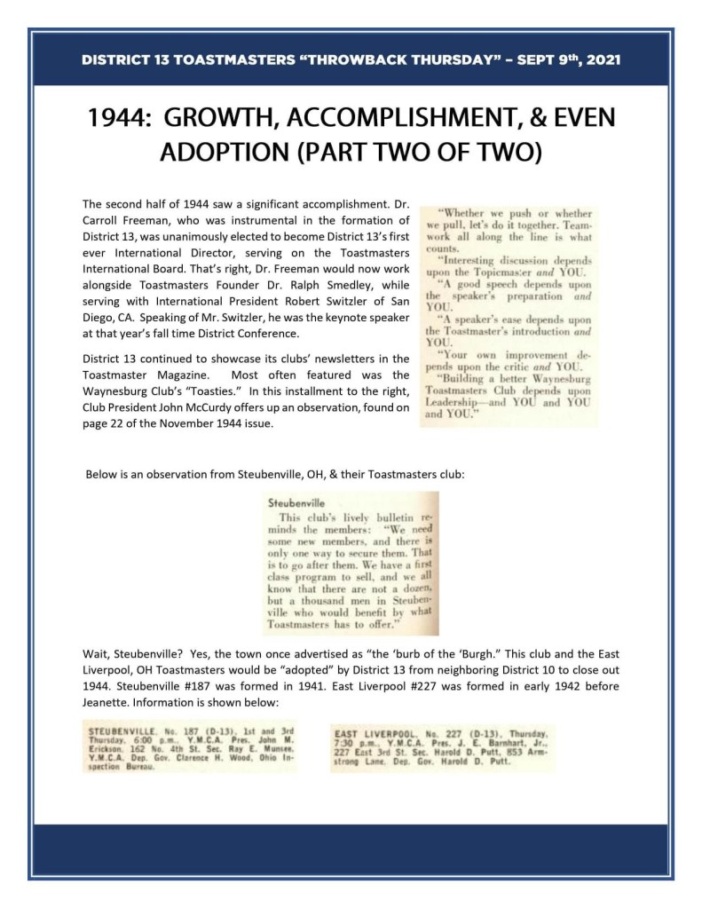 The Waynesburg Clubβs newsletter, βToastiesβ, was featured in Toastmaster magazine. Toastmasters also came to the Ohio Valley with chapters being formed in Steubenville and East Liverpool in the early 1940βs. Those clubs would be adopted by District 13 from neighboring District 10 in 1944.