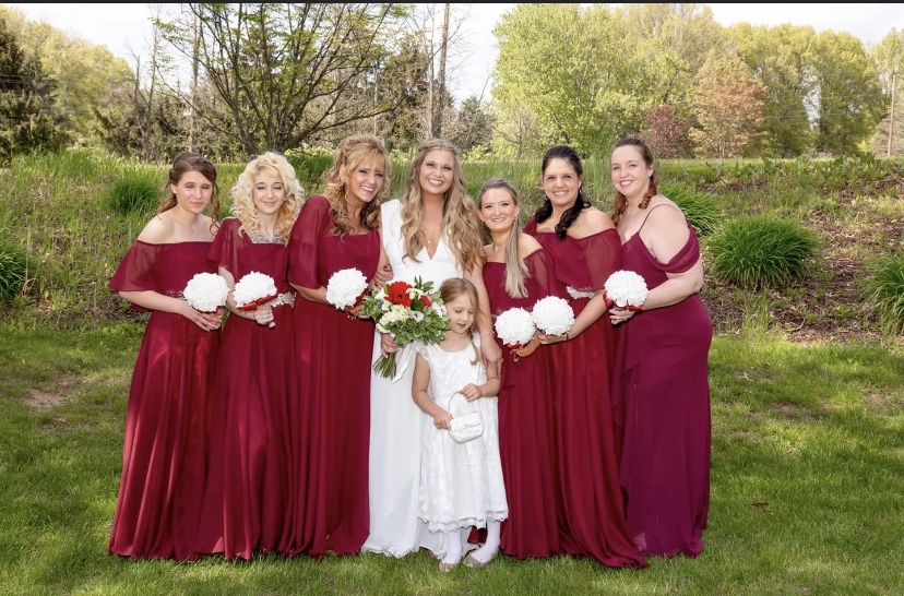 Here’s the picture of Sara, her flower girl, bridesmaids, and Maid/Mom of Honor/Best Mom. Also an extraordinary pic of the bride and groom.