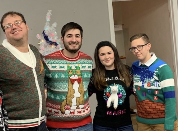 I had her make a portrait of me and my now former coworkers from my work Christmas party back in 2019. I would have had her do the same for that picture of me, Sara and Rob from their wedding; or that one of us in front of the gazebo. Here’s the picture she drew and the girls really loved it.