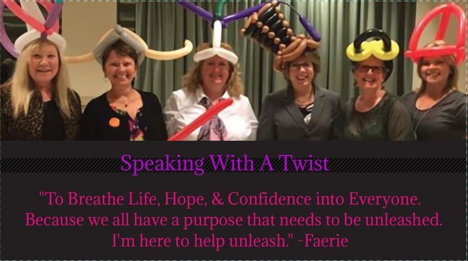 Iโll close off the blog with a shoutout to fellow Toastmaster, friend, author, and motivational speaker Faerie Grace. Speaking with a Twist is amazing and makes your events memorable. Faerie is awesome at her craft and she also makes some sweet balloon animals. Iโd highly recommend her for your next workshop, team building event, or womenโs retreat.