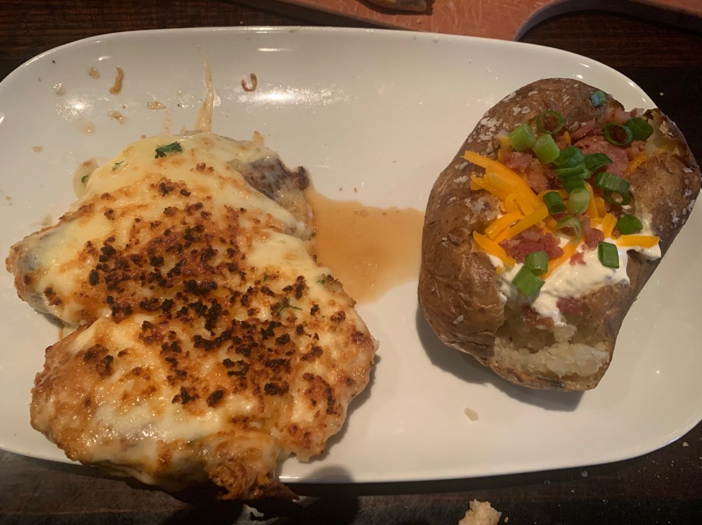 I arrived at the restaurant around 5:30 and was promptly seated by the hostess. The server didn’t waste any time taking my order (it also helped that I knew what I wanted). Maura had eaten at Longhorn before and she suggested the Garlic Parmesan Chicken. That is what I ordered along with a baked potato with the works. For my drink I ordered a seasonal Sam Adams Boston Lager. I was definitely feeling full after my meal.