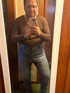 Gray long sleeve Henley–Another nice casual staple that will make a great outfit of the day for a Toastmasters meeting. I’ll pair this with black jeans or leather leggings.
