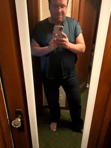 Forest Green Satin Polo–I’m thinking of this as a nice dinner outfit in September or October or a casual piece to wear to a Toastmasters meeting. Pairs well with dark jeans and boots or a nice pair of dress shoes.