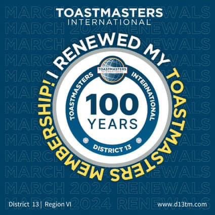 Earlier this week, I renewed my Toastmasters dues for both of my clubs. I reinvested in my growth as a communicator and leader, even 10+ years later and five years after getting my Distinguished Toastmaster award. What keeps me coming back? I can still learn even if I have met my goals. Meeting new people and helping them get acquainted with the educational program is another reason.