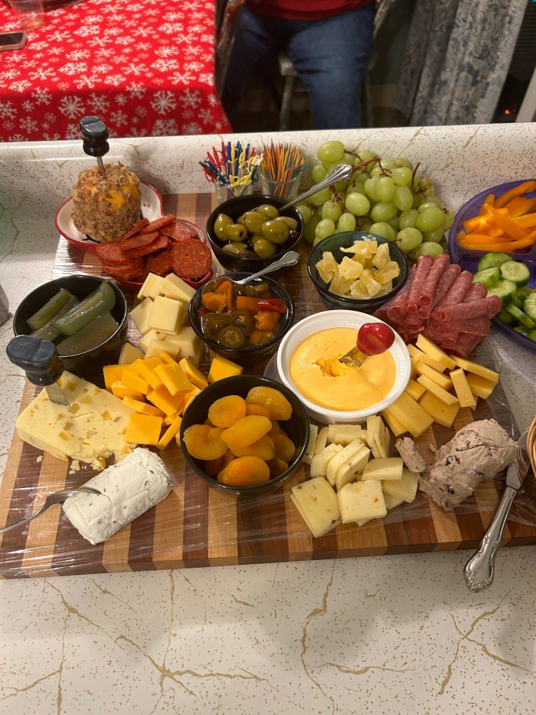 Hearing about cheese balls tonight has me wanting to visit an Italian market and look for things for a charcuterie board. I had success with this at Friendsgiving last year and also at our family reunion as well as on Christmas Eve. Here’s how ours looked last year for Xmas Eve and mine from Friendsgiving (sorry no pic). I got that one at Giant Eagle.