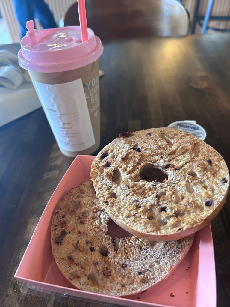 I made a trip to Cutie’s this morning and, for the first time since my initial visit in January 2024, I did not order a featured coffee from the seasonal menu. Cutie’s has evolved with a limited breakfast menu on the weekends and recently started serving New York style bagels. The flavors consist of plain, blueberry, and cinnamon raisin, and will vary as Cutie’s tries different ones. I got the blueberry bagel with cream cheese and an iced coffee.