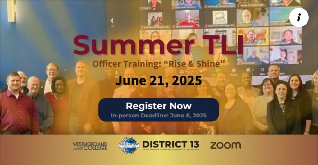 Finally, the countdown to vacation is on. Shit’s getting real as I’m a week away from my first vacation of the year. The other will come in mid-October as the colors change and fruity refreshers will be replaced with pumpkin spice lattes. My plan for the speech I’m giving Wednesday night will have me talking about how I’m spending my summer vacation. One of those scheduled events on the agenda is Summer TLI next Saturday morning at Westmoreland County Community College. I’m looking ahead to reuniting with my Toastmasters friends, applying what I learn at the officer breakout sessions to my role in my home club, and enjoying a nice lunch. Is my speaking streak going to continue? I believe so as I have speeches scheduled for the first few months of the new Toastmasters year (so, for now through September).